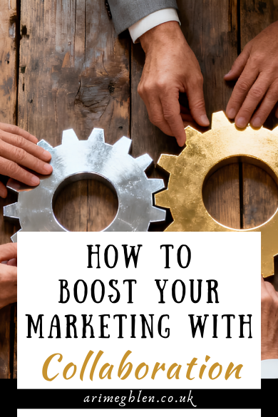 Image of several hands holding two cogs together on a wooden desk. text overlay reads  How to boost your marketing with collaboration. AriMeghlen.co.uk