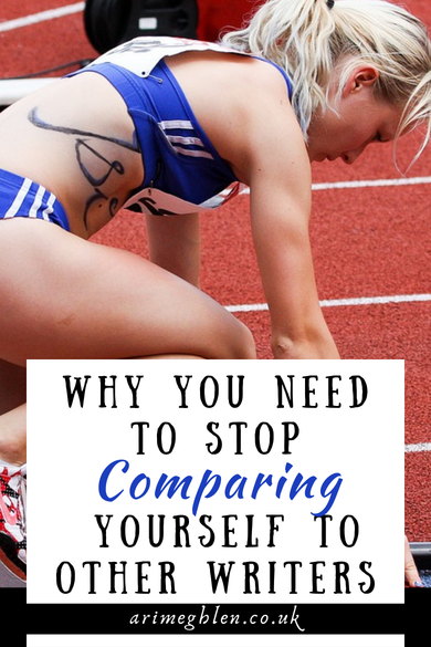 Photo of a female relay runner on the track in a crouched position. Text overlay reads Why you ned to stop comparing yourslf to other writers. AriMeghlen.co.uk